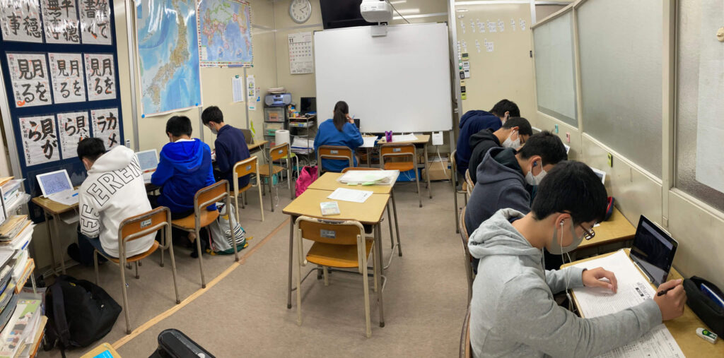 中3生は過去問演習。2019年の数学、英語、理科をおこなっています。