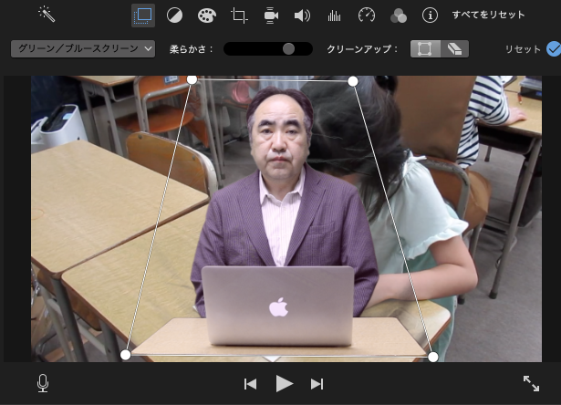 処理はとても簡単です。ふたつの素材を並べておいて、グリーンのスクリーンをバックに撮った動画を選択し、グリーンスクリーンというボタンをクリックするだけです。あとは、抜きたくない部分を微調整して、透明度を調整して終わり、という流れです。