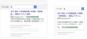わたしがはじめたのは「リスティング広告」です。塾から半径数キロメートル以内の方が、こちらが指定したキーワードで検索をするとmiyajukuの広告が表示される、というものです。そんなにたくさんの予算をかけられないので、おっきな塾の方が上位に表示されたり、miyajukuはまったく表示されなかったり、ということもあります。リスティング広告は入札制なんですね。