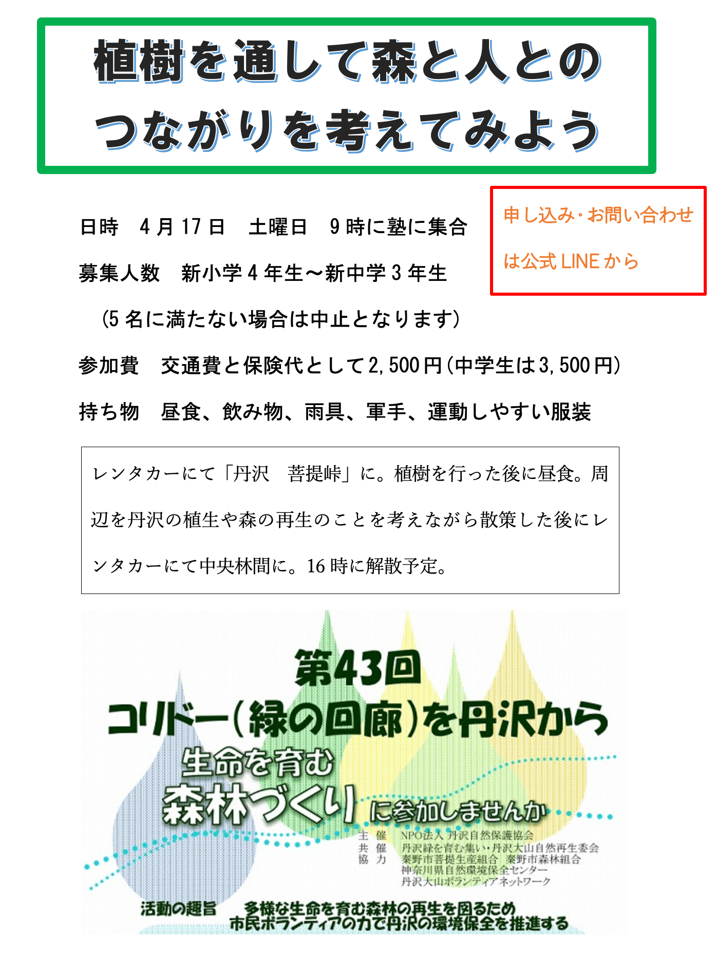 先ず、4月17日に「生命を育む森林づくり」ということで、丹沢自然保護協会主催の植樹イベントに小中学生の希望者を連れていく予定です。