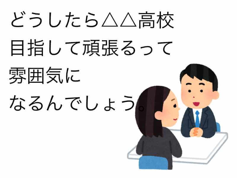 [voice icon=”https://miyajuku.com/wp-content/uploads/2019/05/e5b6bac8b8174eca00ad0c47514efd3a.jpg” name=”miyajuku塾長” type=”r fb”]今の子どもたちは「△△高校を目指してがんばる」とはいつまでたってもならないと思います。失敗を恐れるので身の丈にあった進学をすればいい、と思う生徒が多いです。昔のように「ひとつでも上を目指して」といった時代の雰囲気はありません。[/voice]