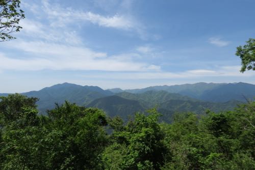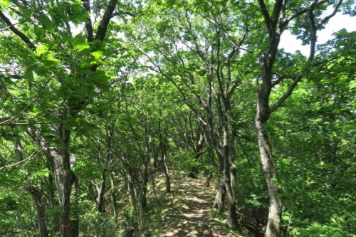 このコースは、下の方は植林帯ですが、経が岳からの稜線は、広葉樹の森になっています。新緑の緑が本当にきれいでした。そんな緑の中にアカヤシオツツジがところどころに彩りを加えていました。緑の木々を揺らす風も気持ちよかったです。