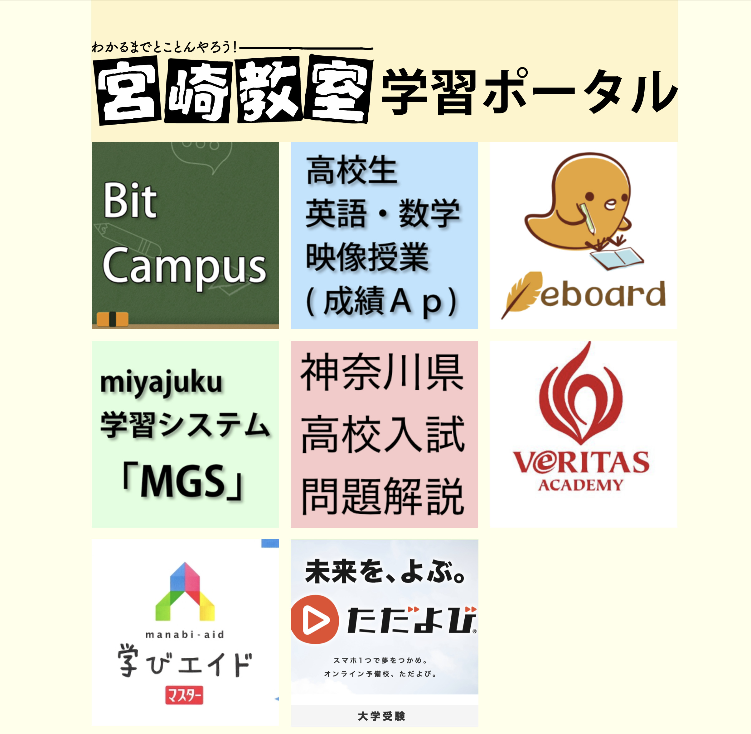 miyajukuには「ポータルサイト」があって、すべてそこから入っていけるようにしてあります。長いこといろんな映像授業や演習教材としてのICTを利用してきて、今はこれが最もうちの生徒たちにとって使い勝手が良い、というものを利用しています。