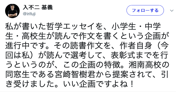 7月15日に表彰式を予定しています。当日は入不二先生にお越しいただき、講演もしていただきます。定員が100名の会場なので、どこまでの方に来ていただけるかはこれから精査しますが、個人的な気持ちとしては「みんなに聞いてもらいたい」と思っています。だって、日本の「知」の先端にいる大人の話を聞けるのですから。しかも、その方の文章を読んで、自らもそこからいろいろと考えたのですから。