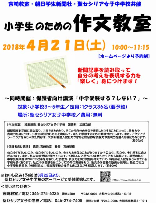 この作文講座は、宮﨑教室、朝日学生新聞社、聖セシリア女子中学校の共催で実施するものです。当日は、新聞記事を読み取って自分の考えを表現する力を「楽しく」身につける生徒向けの講座と、中学受験する? しない? という保護者向けの講座を同時におこないます。費用は無料です。先着36名で予約が必要です。残席は少なくなっていますので、ご興味のある方はお早めにお申し込みください。
