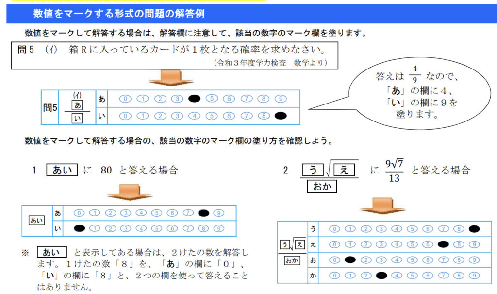 見てわかるように、分数なら「分母」と「分子」の数字をそれぞれにマークする形式になっています。また、「十の位」と「一の位」の数字をそれぞれマークする形式も導入されています。根号をふくむ場合はかなり面倒ですね。