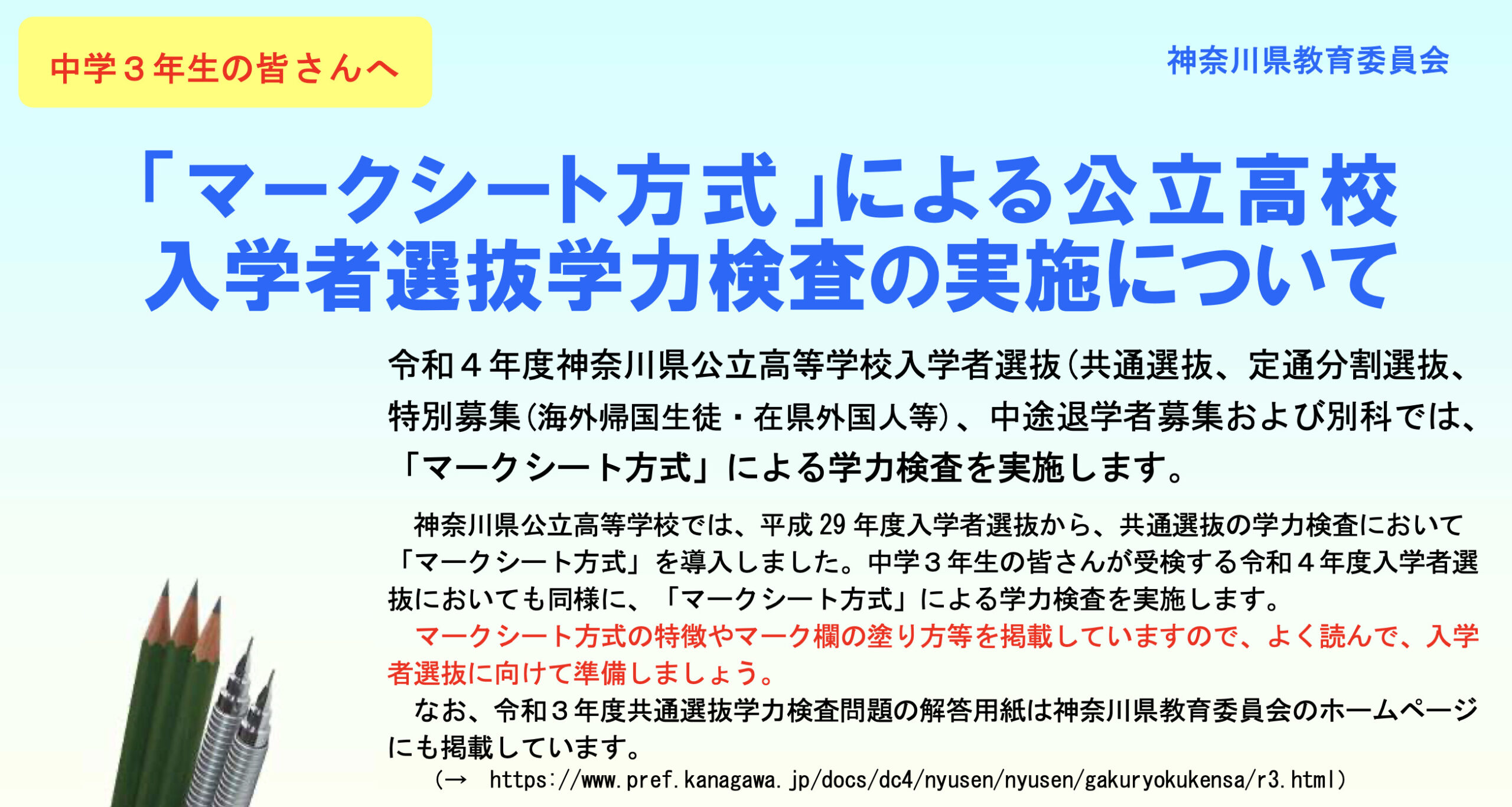 中3受験生は学校からプリントを配布されているはずですが、県教委から「来春入試でのマークシートの書き方」がアナウンスされています。