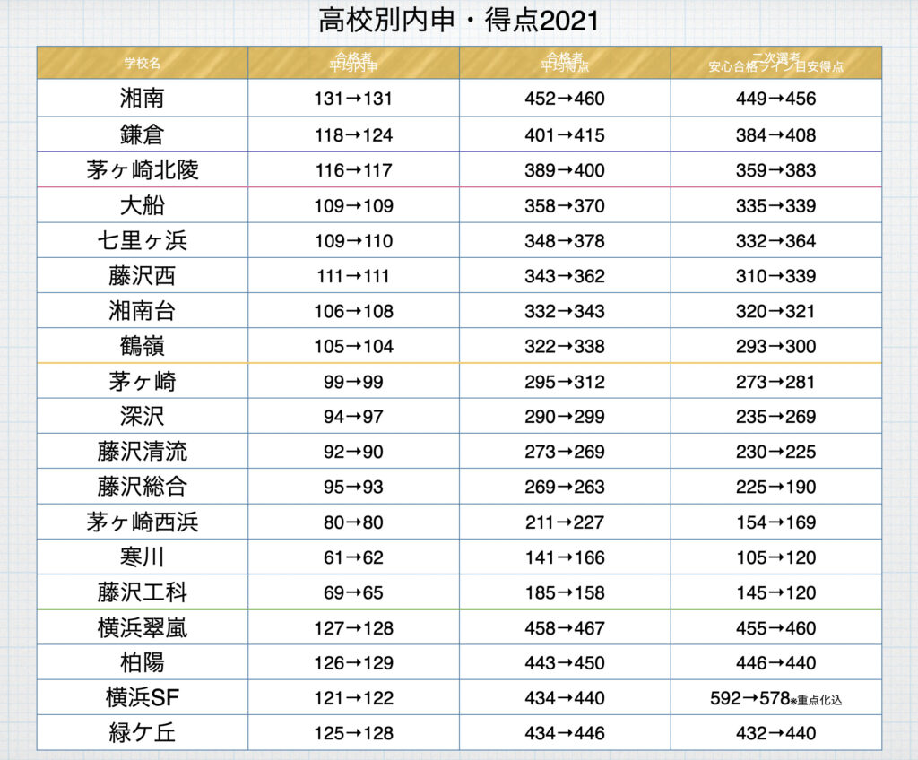 表は左から「学校名、学校成績、入試得点、2次選考ボーダー」です。すべて今春入試での合格者平均です。左が昨年(2020年)のものなので、昨年度との比較もできるようにしてあります。
