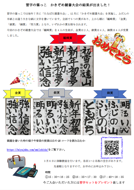習字の筆っこ「観峰賞」 2019 1/27 塾の毎日についての記事 2019年1月27日 今日も朝から小6と中3の入試対策演習です。 習字の筆っこのクラスの「競書大会」で、最高賞の「観峰賞」を4人の生徒がいただきました。 みんな頑張っています。 ホームへもどる 学習相談はこちら 塾の毎日についての記事 よかったらシェアしてね! URLをコピーしました! URLをコピーしました! 「MARCHはもう古い 注目の大学グループは「SMART」だ! 中3生のここから2週間の学習について この記事を書いた人 miyajuku 関連記事 10分良書作文コンクールの表彰式 2022年10月23日 塾の夏休み中の課題 2022年8月5日 森の学校 7月18日 2022年7月20日 森の学校 7月17日 2022年7月19日 お休みのお知らせ 2022年4月28日 みんな中学卒業おめでとう! 2022年3月26日 加賀宝生 2022年3月25日 中3の直前日曜講習 2022年1月23日