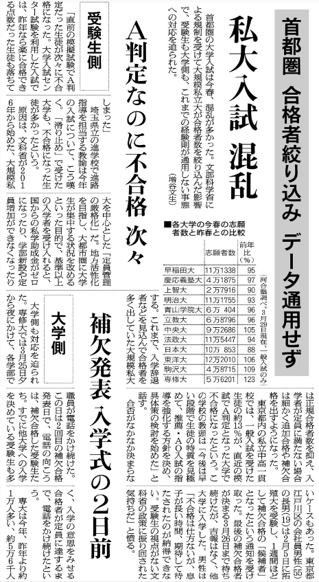 首都圏の私立大学入試が混乱している、という記事でした。どのように混乱しているかというと。
