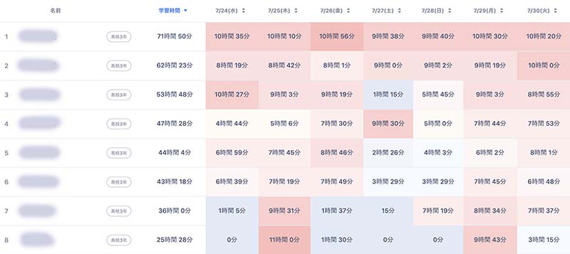 高3生は「塾に住んでいる」といっても良いほど、朝から夕方まで、または夜まで学習をしています。下は、高3生の学習記録です。時間が短いのは学習記録をつけ忘れてしまう生徒がいるからですし、面倒がってすべての学習時間を記録していない生徒もいます。それでも、みんな10時間前後は勉強をしています。まぁ、高3生だから当たり前ですが。