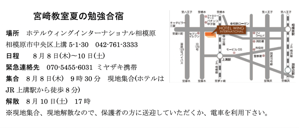 高3生たちは夏講習の最後に2泊3日の夏合宿を予定しています。miyajukuとしてもこの時期に勉強合宿を組むのは初めてです。学習管理型のシステムで学んできた生徒たちもいるので、この時期にしっかりと「学ぶことの基本」をそれぞれの身体に染みこませよう、という予定です。また、わたしが他の学年も教えているので、なかなか高3生だけにかかりきりになれません。寝食をともにしてがっつりと受験に向けての姿勢をつくってもらおう、ということです。