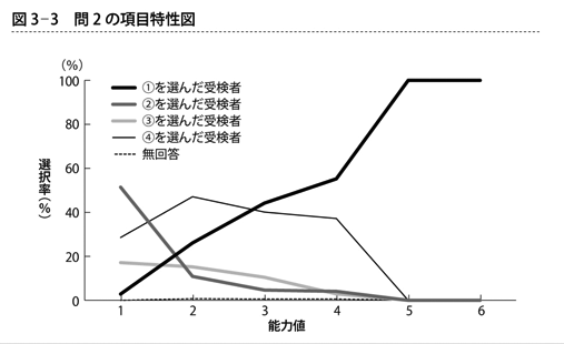 下の図を見ればわかります。読解能力が3、つまりほぼ真ん中あたりまで選択肢④のほうが正解の①より多く選ばれていることがわかります。つまり「Alexandraの愛称は女性である」が正解だと考える子が案外いるのです。どうしてでしょう。おそらく「愛称」という言葉を知らないからです。そして、知らない単語が出てくると、それを飛ばして読むという読みの習性があるためです。「Alexandraは女性である」ならば、文として意味が通ります。