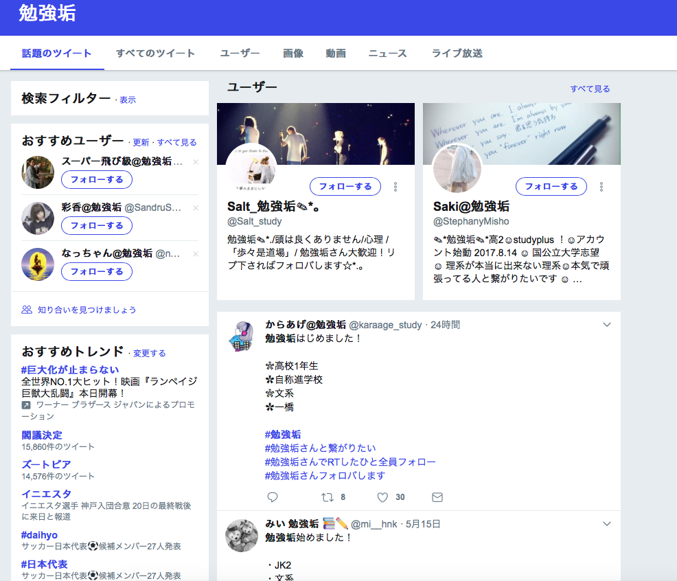 簡単に言うと、「勉強垢」というのはTwitterの勉強用アカウントのことです。試しに、お持ちのスマホで「勉強垢」と検索をかけてみてください。でてきますよね。みんな様々にツィートしています。最近ではInstagramの「勉強垢」も増殖中とのこと。