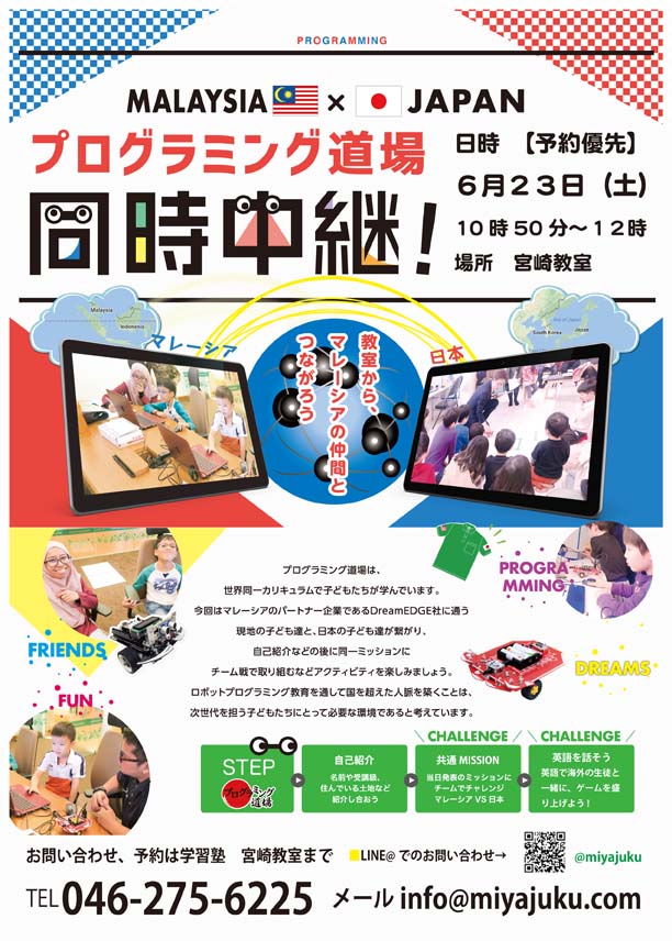 6月23日(土)にマレーシアとインターネット回線でつなぎ、現地の子どもたちとワークショップをおこないます。基本的には「プログラミング道場」の生徒が参加しますが、miyajukuの他のキッズクラス(そろばん、習字)、小中学生の各クラスに通っている生徒も参加できます。