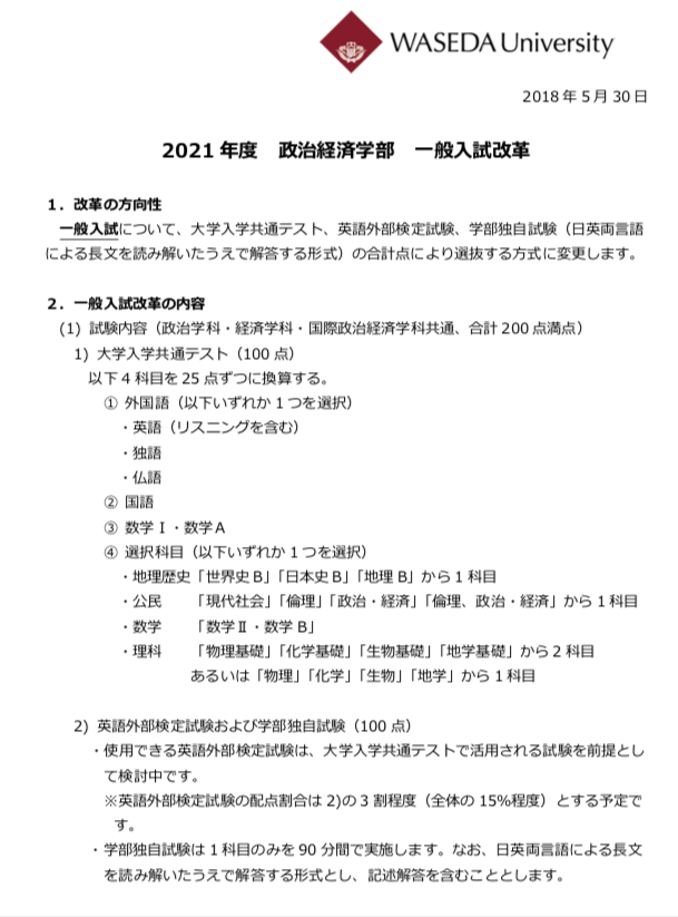 先日、早稲田大学が発表した2020年度以降の入試の改革をみるとそれがよくわかります。政治経済学部の一般入試改革を例に見てみましょう。