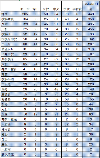 高校の偏差値がSS50あたりというと、旧学区の3番手校になります。大和西や瀬谷あたりですね。30名前後の合格者ということは、実合格者は10名ちょっとでしょう。もちろん浪人も含めてです。これらの学校では、各クラスのトップがGMARCHに行くのかな、というのが実際のところだと思います。
