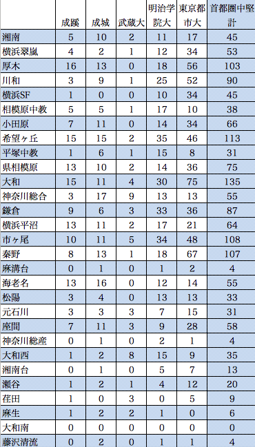 周辺公立高校からの今春大学合格実績の「成蹊、成城、武蔵、明治学院、東京都市大」編です。