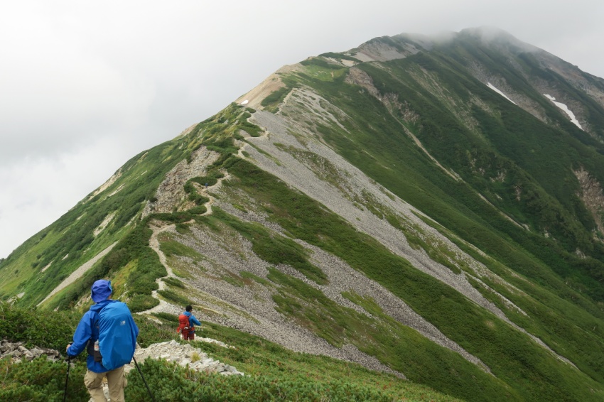 今年の北アルプスの天気は不安定で、2泊3日のうちそこそこ晴れていたのは数時間のみ。三千㍍の稜線では強風にあおられ、ほとんど真っ白いガスの中の登山になりました。それでも楽しい登山になりました。どんな状況になっても「楽しむ」というのが「山登り」です。