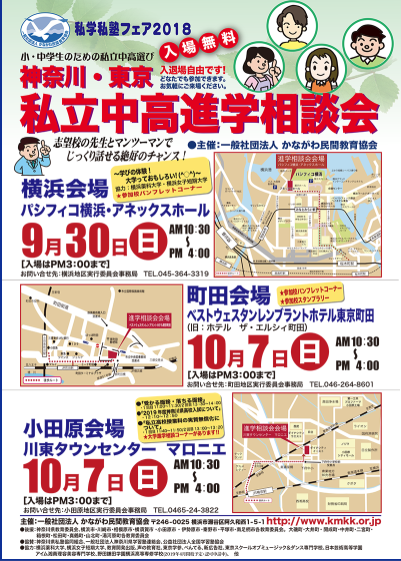 この時期、あちこちで進学相談会がおこなわれます。そんな中、学習塾の団体が主催している進学相談会が以下のものです。とくに町田会場でおこなわれるものは、わたしが実行委員長になっています。