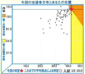 さて、返却された帳票では志望校の判定に注目してください。縦軸が学校成績、横軸が入試得点(今回の模試得点)です。オレンジの中が1次選考合格、黄色の中が2次選考合格です。縦軸に上にいても、横軸が左ということは「実力不足」ということになます。県の高校入試は「学校成績+入試+面接」の1次選考と「入試のみ」の2次選考があります。学校成績がどんなに悪くても(縦軸が下位でも)、入試で良い成績を修めれば(横軸が右の位置)合格できます。