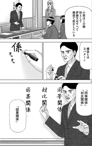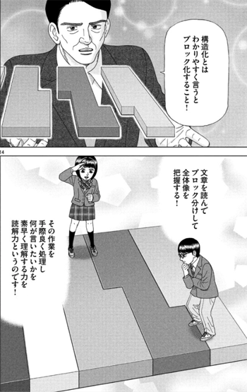 そこで先生が「あなたたちは文章の構造がわかっていないから読解力が不十分なのだ」と言います。「読解とは単に読むことではなく、文章を読んで頭の中で構造化することなのだ」と。ふむふむ、良いことを言いますね。さらに「構造化とはブロック化のことで、文章を読んでブロック化し、その作業を手際よくすることで、何が言いたいのかを素早く理解する力を読解力というのだ」と進みます。