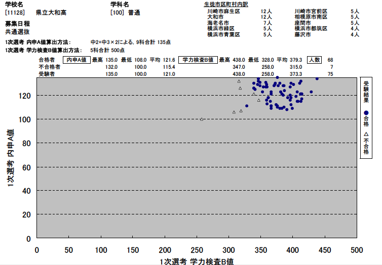 この生徒たちは2次選考での合格だろうと予想されるので、2次選考の合格ラインは375点ぐらいだったと予想できます。つまり、[su_highlight background=”#fdfdc7″]内申が何点であろうと、375点をこえていれば今春入試で大和高校には合格できた[/su_highlight]、ということです。