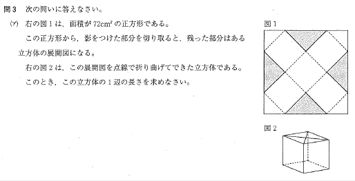 中3生の昨日の予想問題演習の一問。よい問題だ。立方体の一辺の長さをXcmとすると、図1の白い部分は立方体の表面積に等しく、(X×X)×6になる。影の部分は直角二等辺三角形が4っつ分なので(1/2×X×X)×4。このふたつを足して72になれば良い。