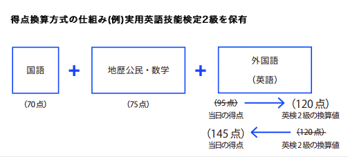 英検2級で英語の得点を8割とみなす大学が多いが、入試を受けてそれ以上の得点をとればそちらを得点として認めてくれる、という仕組みもとっているところが多い。