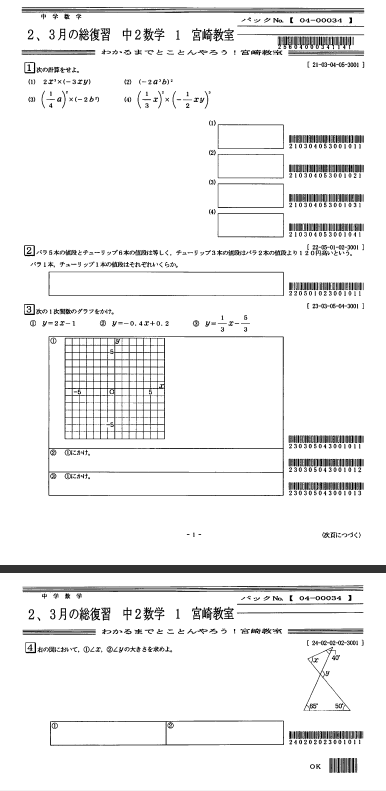 miyajukuでは、数、英、理、社について「小テスト」をひたすらに課していく学習法をここから1ヶ月は進めていきます。下の写真は数学の小テストです。いつものように「スーパー学習システム・メビウス」で問題を作成しています。できなかった問題は個々に「弱点対策問題」が出力されるのもいつも通りです。今回は、1回までに設定しています。内容はこの1年の学習の復習+前学年の学習内容の復習です。