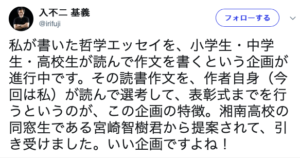 入不二先生の文章は、今の高校生が使っている現代国語の教科書にも題材として使われています。現代日本の「知」の先端にいる方です。その「知」の先人の文章を読み、講評、表彰、講演までしていただけます。多くの子どもたちに「すばらしいオトナ」に接してもらいたいと切に願っています。