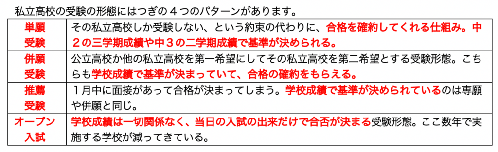 オープン入試以外はすべて[su_highlight background=”#fdf893″ color=”#f62020″]「前もって合格が確約されている」入試[/su_highlight]になります。最近では当日の筆記試験がない「書類選考入試」も増えています。そうした「書類選考入試」でなく、2月に筆記試験があったとしてもその試験の結果で合否が決まるわけではありません。基本的には[su_highlight background=”#fdf893″ color=”#f62020″]前もって中学校と私立高校の間で「確約」がされてのもの[/su_highlight]になります。