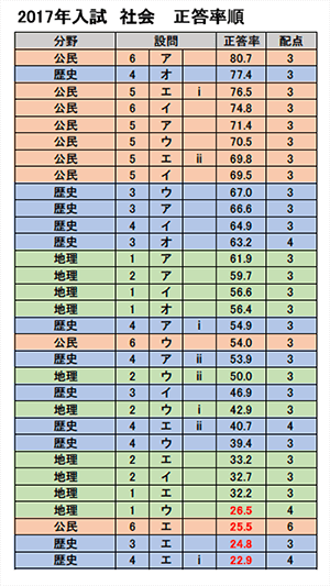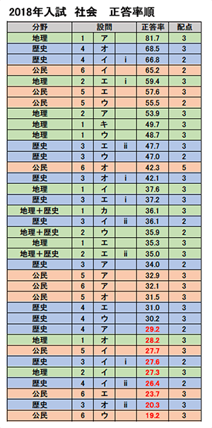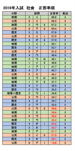まず、2017年に比べて2018年、2019年と[su_highlight background=”#fdf893″ color=”#f62020″]赤い数字になっている正答率が30%以下の問題が増えている[/su_highlight]のが一目瞭然です。そして、2017年は公民分野が比較的に取り組みやすい出題が多かったのが、2019年の出題では各分野ともばらけていて[su_highlight background=”#fdf893″ color=”#f62020″]3分野のどれが易しく、どれが難しいという区分けがつかなくなっている[/su_highlight]のが分かります。