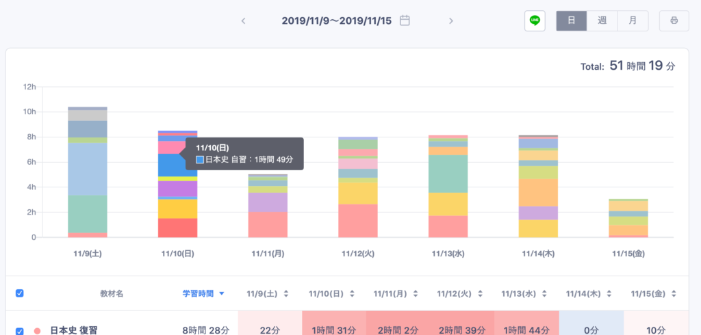 ↓ はmiyajukuの高3生K子のアナリティクスです。こうして学習時間と学習内容が可視化されていけば、つぎに何をしなければいけないのかがはっきりしていきます。