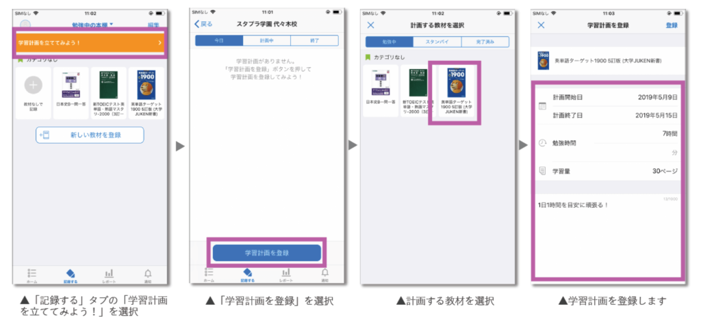 テキストを登録し、それぞれのテキストについて「いつまでに」「どのぐらいの量を」学習するのかを記入します。基本的な流れはわたしの方で作りますが、自分で計画を立てられるようになりましょう。プランニングのしかたは以下の通りです。