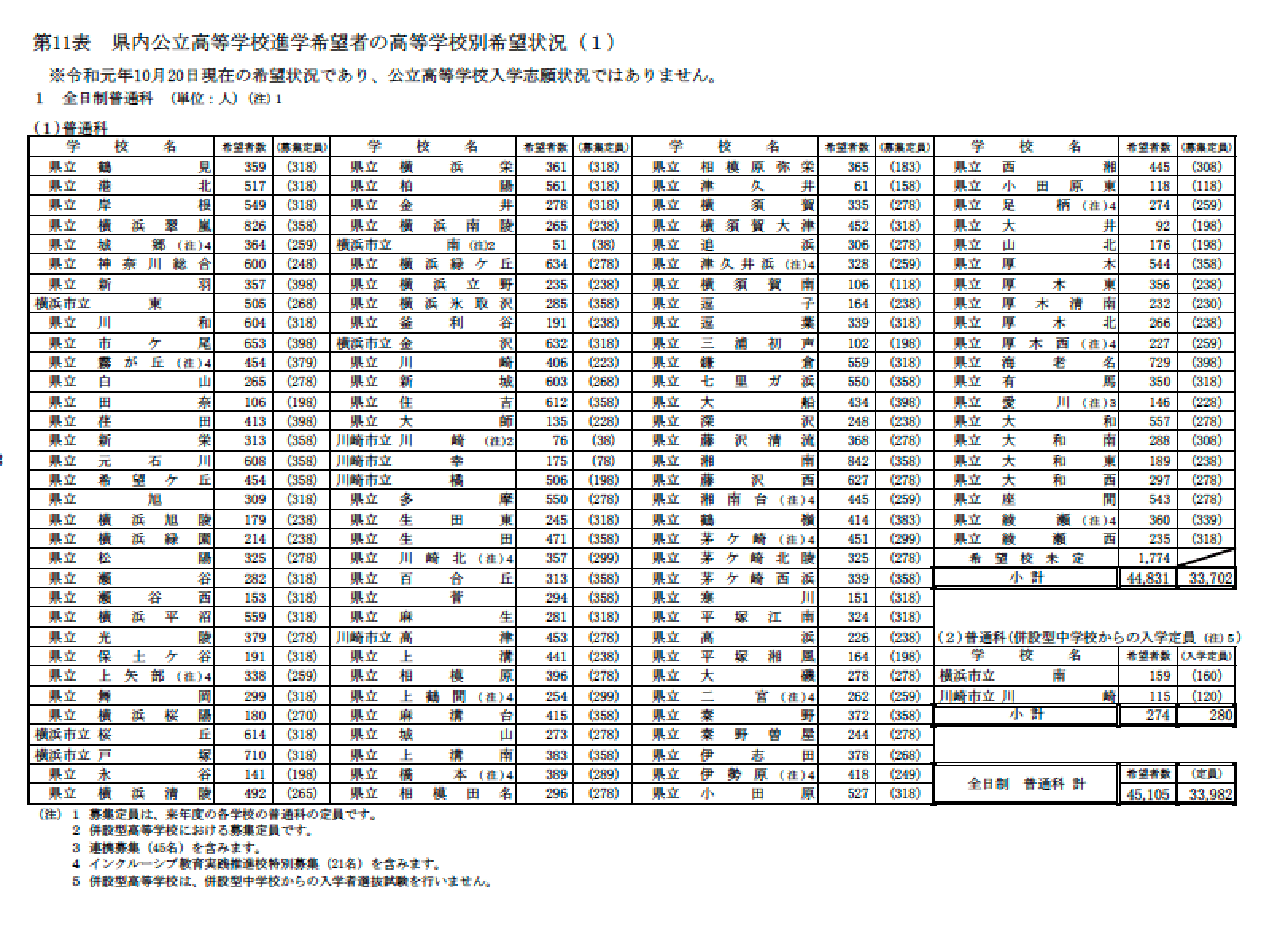 神奈川県教委から来春高校入試での「高校別進学者希望者数」の一覧が発表になりました。