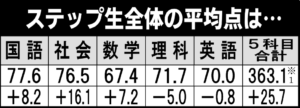 トップ校での上昇よりも、中堅校での上昇の方が大きいですね。ただ、これも母集団しだいなのでなんとも言えません。昨年度の神奈川県全体の平均点に比べて、ステップの5科計の平均点は73.9点も高かったので、ここで発表された平均点がかなり高かったからといって、受験生のみんなはびっくりすることはありません。