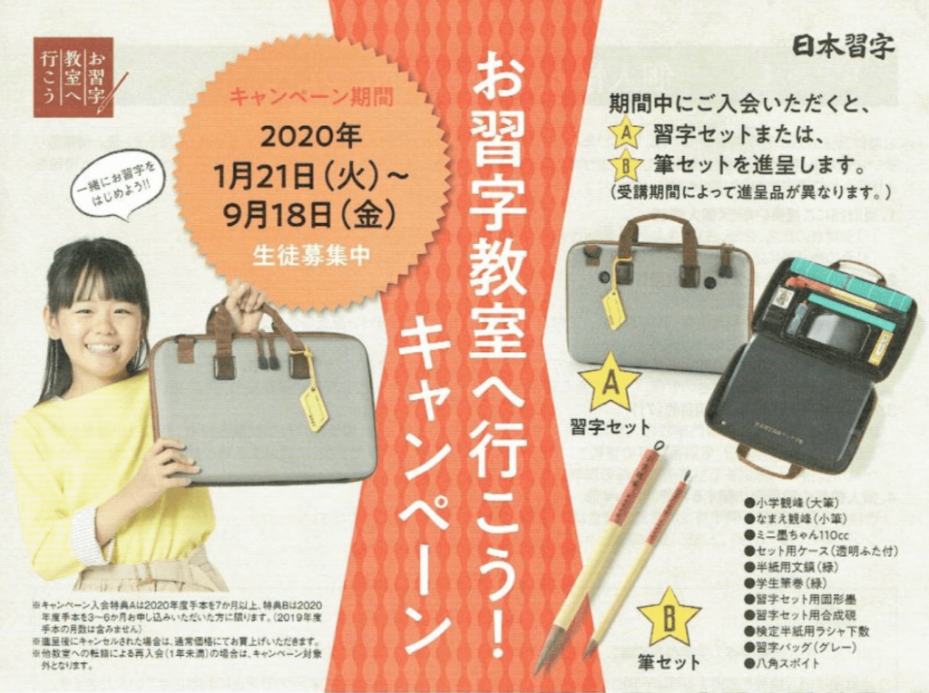 ただ今、春のキャンペーンを実施中ですので、新入会の方にはもれなく「お習字セット一式」をプレゼントさせていただきます。