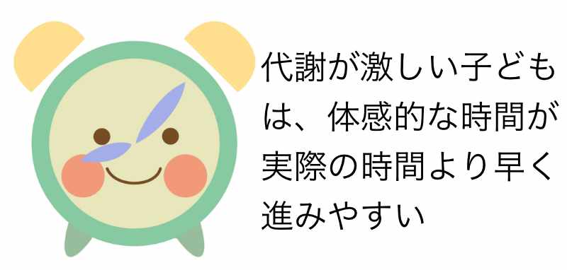 代謝が激しいと、体感的な時間が実際よりも長くなることもわかっています。子どもは代謝が良いので、体感的な時間の方が実際の時間よりも早く進みやすい。一方、年をとると代謝が落ちてくるので、実際の時間の方が早く進んで「もう1年すぎたの!?」と驚くことになります。体感的な時間はいろんな要因によって長くなったり短くなったりします。そのうえ、子どもは時計の時間に合わせて行動することになれていないので、時間を守れないことが多くなりがちです。
