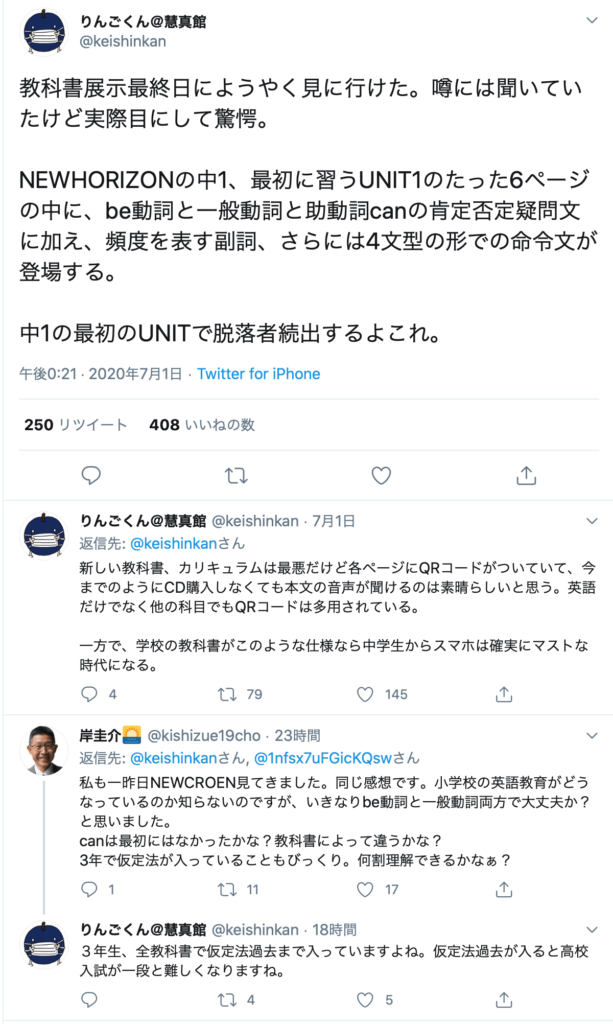 来春は中学校の教科書の改訂年度です。しかも、新指導要領に変わる年なので、大きく学習内容がかわります。そんな教科書の閲覧会が各地でおこなわれていて、新教科書を見た塾関係者の方が「英語の教科書が大変なことになっている」と発信しています。