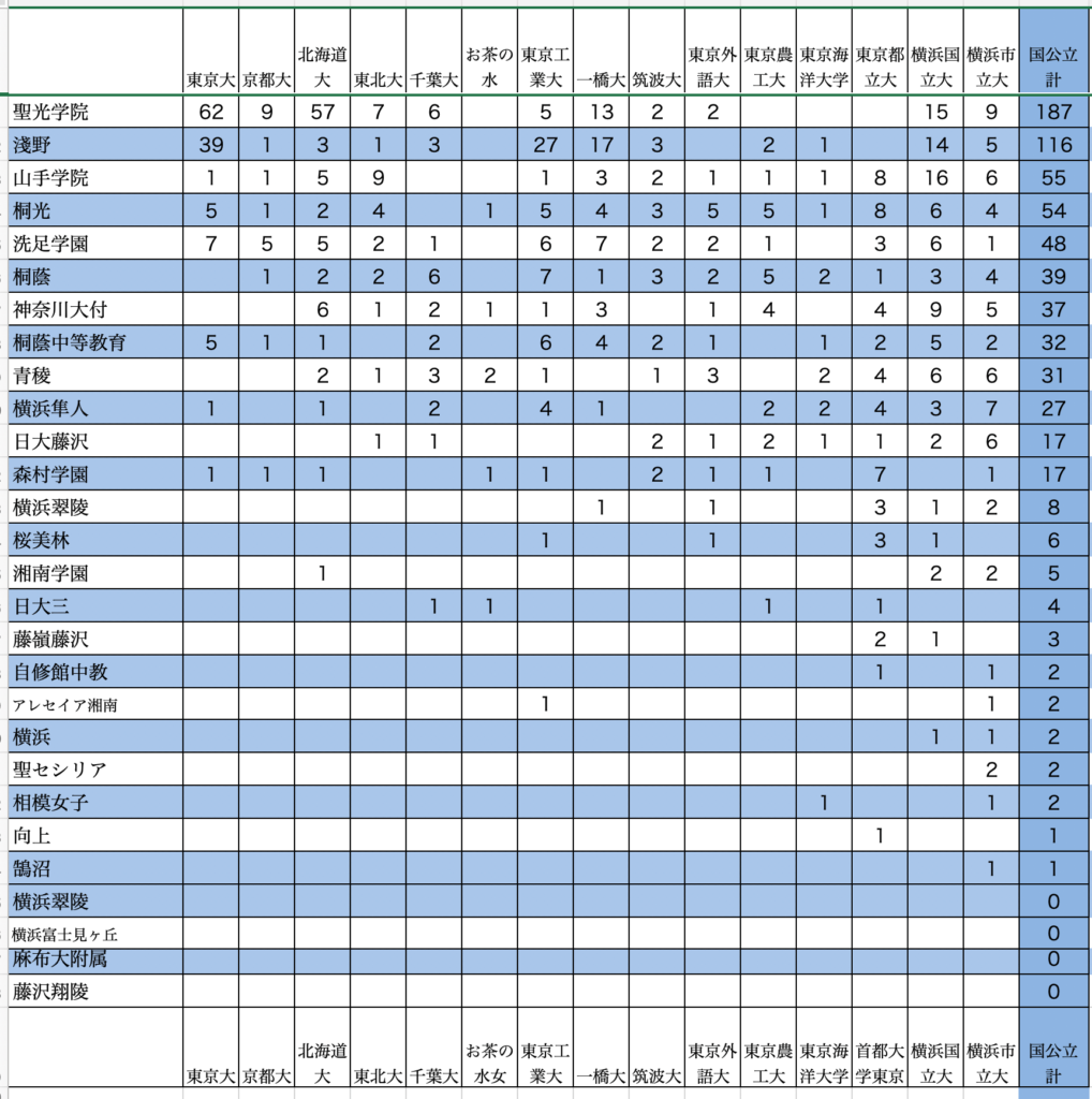 女子校ですが洗足学園の実績はすごいです。私立中学受験としてはそれほど高い難易度の学校ではありません。それでこの実績を出すのですから、6年間の学校の学習指導がいかに優れているかの証左でしょう。桐光学園も上位大から地元国公立まで広く合格者を出しています。横浜翠陵も地元国公立大にですが実績を出しています。入学時の生徒の実力からするとかなり頑張っているといえます。他にも青稜や横浜隼人なども頑張っているといえるでしょう。