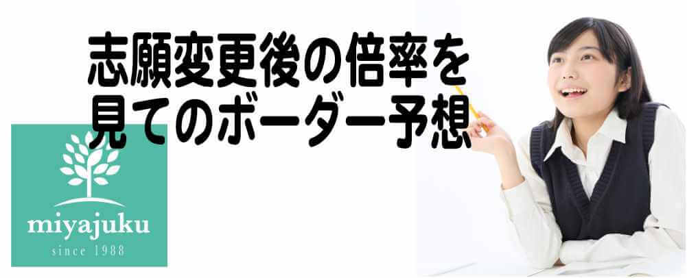 さて、志願変更後の確定倍率が発表になりました。このあと一部の「当日の入試で合否が決まる私立高校」の入試を受験して合格が決まり、当日欠席をする小数の生徒をのぞいてこの倍率で15日の入試がおこなわれることになります。今回は、大胆に「昨年春の入試と難易度が同じぐらいだった場合のぎりぎりのボーダー」を予想したいと思います。うちの塾の生徒が受験する学校のみ、あくまでもmiyajuku塾長の私見です。