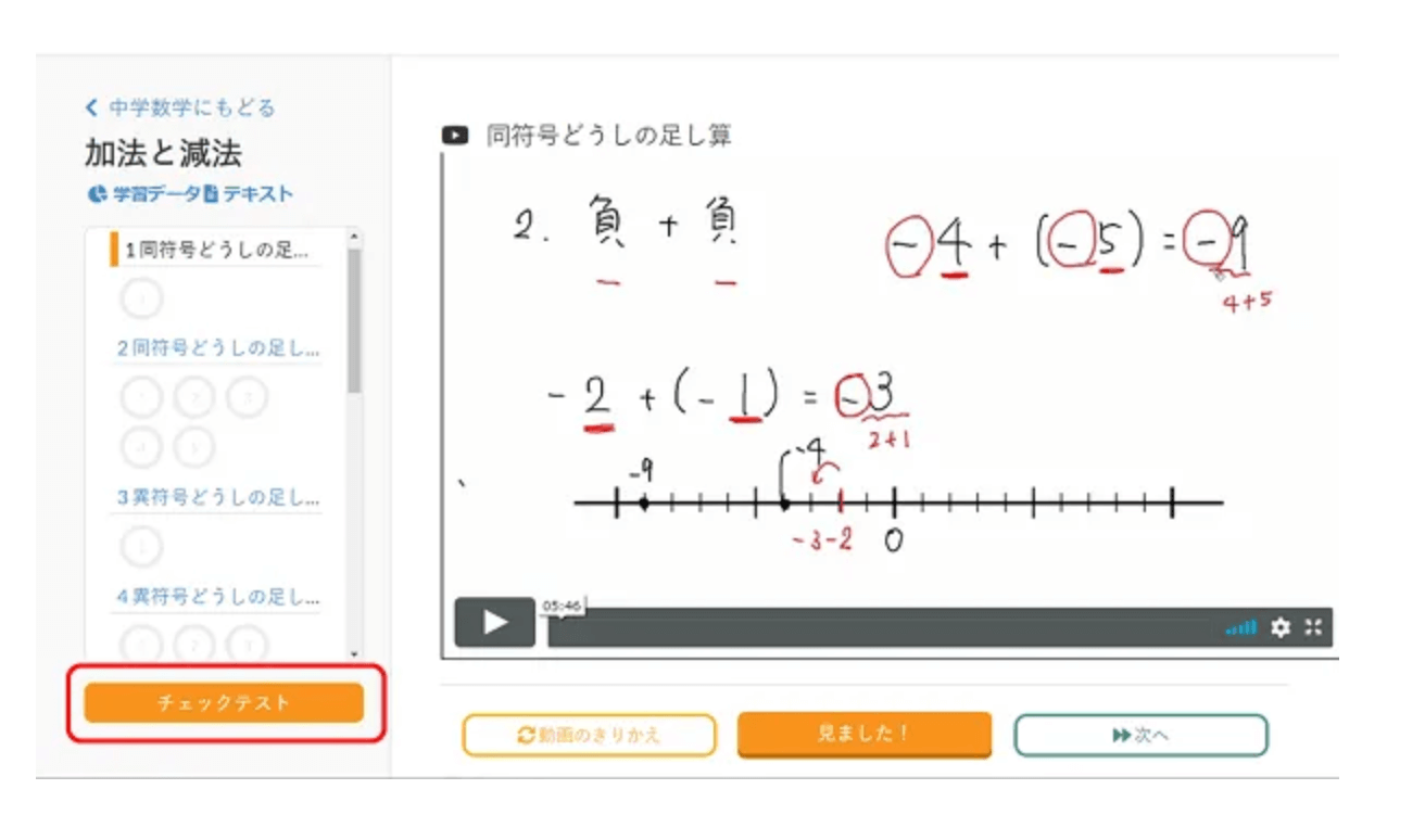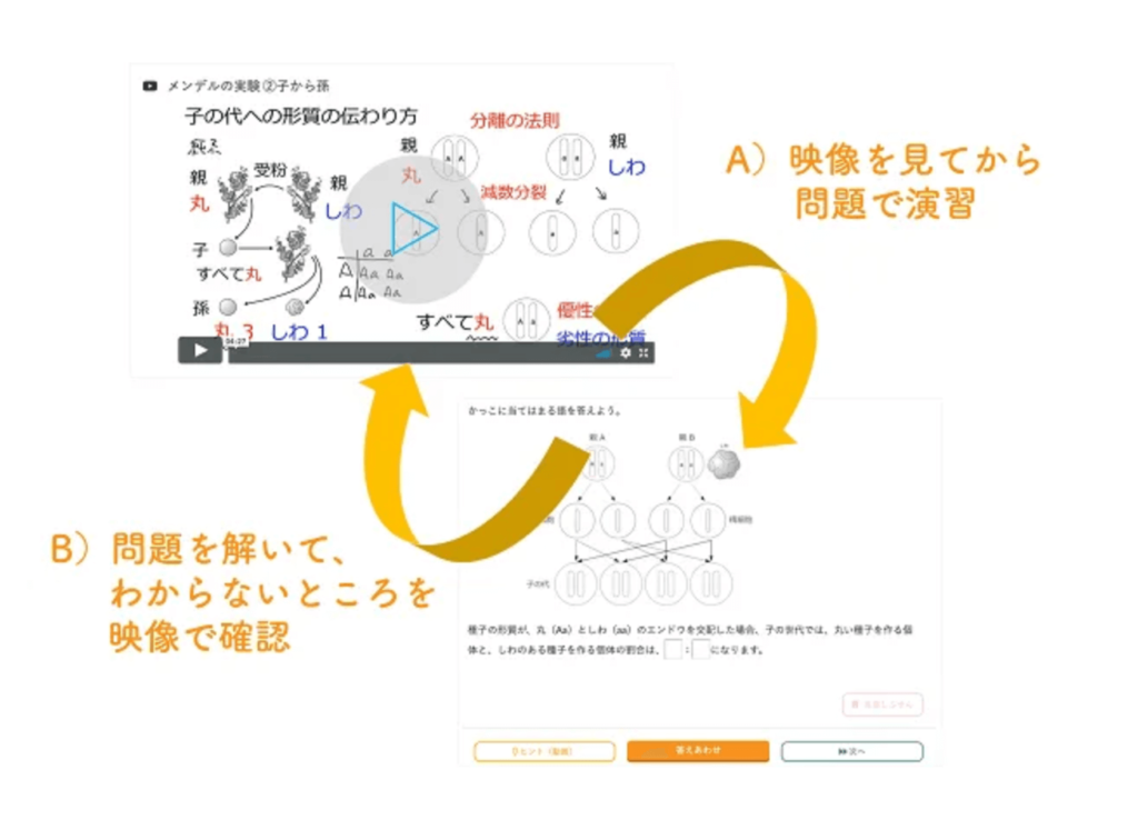 先ずは「e-board」から。e-boardは、映像授業と画面上で実施する確認テストがセットになっています。たとえば、中学1年生の理科の学習で「花のつくりとはたらき」の単元をクリックすると映像授業がはじまります。それを視聴するとつぎにその内容に合わせたデジタル問題が出題されます。答え合わせも画面上ででき、間違えたときは「?」ボタンをクリックするとヒントやヒント動画が見られます。2度間違えると「答えを見る」ボタンが表示されて答えと解説を見ることになります。さらに単元ごとにチェックテストも用意されていて5問中4問以上の正解で単元クリアとなります。学習の記録は生徒自身も確認できますし、わたしが管理画面から確認することも可能です。