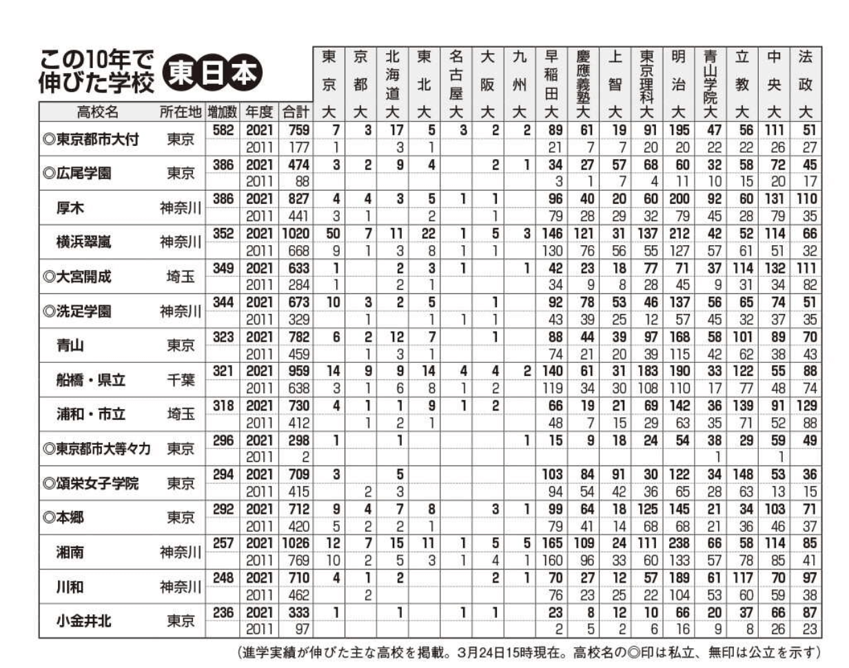 サンデー毎日の4月11日号の記事に「この10年で伸びた学校」というのがまとめられていました。東大、京大などの旧帝大、早慶上理やMARCHといった首都圏難関私立大への合格実績を2011年と2021年で比べて合計が増えた学校を「伸びた」と定義したものです。神奈川県からは公立高校で「厚木、横浜翠嵐、湘南、川和」の4校が、私立では「洗足学園」が掲載されています。