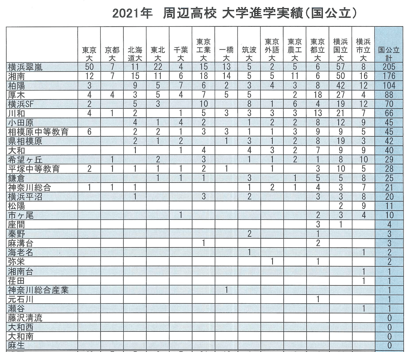 神奈川ツートップの「横浜翠嵐」「湘南」からの合格者はそれぞれ200人前後とさすがの実績です。とくに「横浜翠嵐」の東大50名という実績は全国に衝撃の事実として伝えられました。神奈川の県立高校が私立の御三家である浅野や栄光よりも東大の合格者数をこえるなんて!! 県が推進してきた「県立高校の進学重点校」という仕組みの成果です。この2校は全国の旧帝大や東京工業大、一橋大などの超難関大への合格者も増えていて、地元の横浜国大、市大への合格者数もかなりの数です。