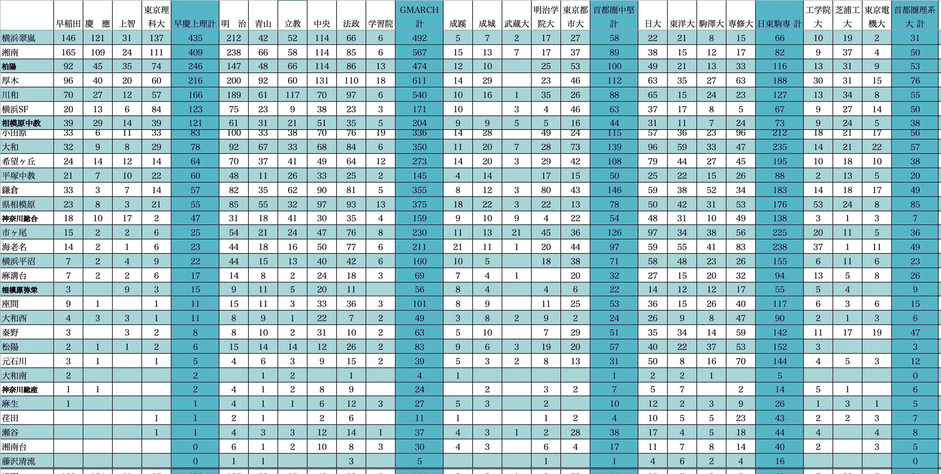 早慶上理大レベルへの合格はそう簡単なことではありません。全国から優秀な生徒たちがこれらの大学を目指して受験をしてきます。それでも横浜翠嵐や湘南からはこうした数字の生徒たちが合格をしていきます。逆に旧学区の準トップでは総数で十数名といった数字になり、それより下の高校では合格者はほぼいないことになってしまいます。