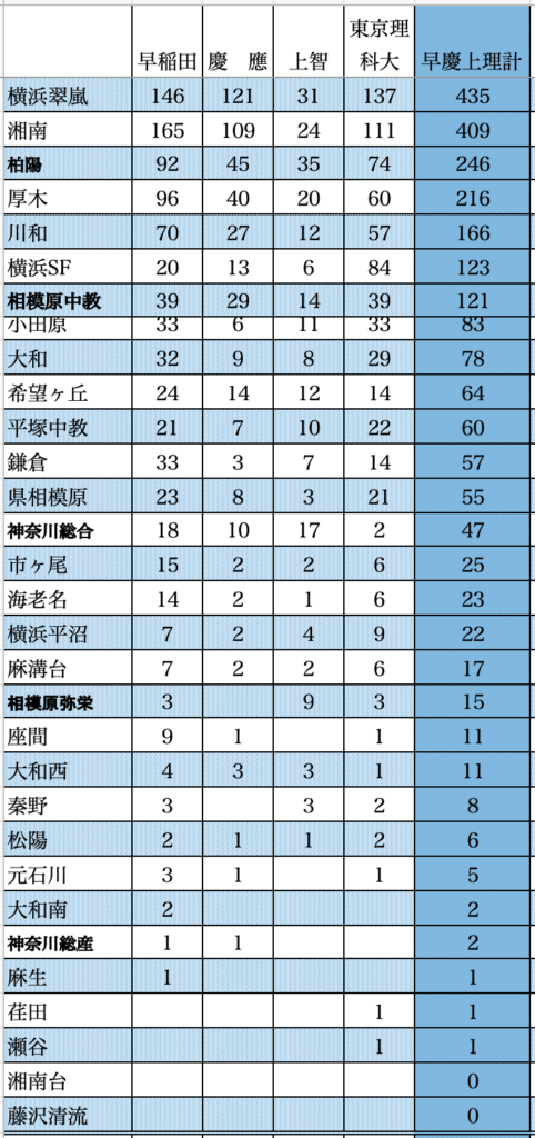 中でもツートップの横浜翠嵐と湘南は400名ごえの合格者数となっています。それぞれ卒業生数が408名と356名です。合格者の数字は浪人生も含んでいて、1人で数校の合格者もいるので正確には卒業生のどのぐらいの割合が早慶上理レベルに進学しているかはわかりません。たとえば東大に合格した生徒はこのレベルの私大にも複数合格しているはずです。
