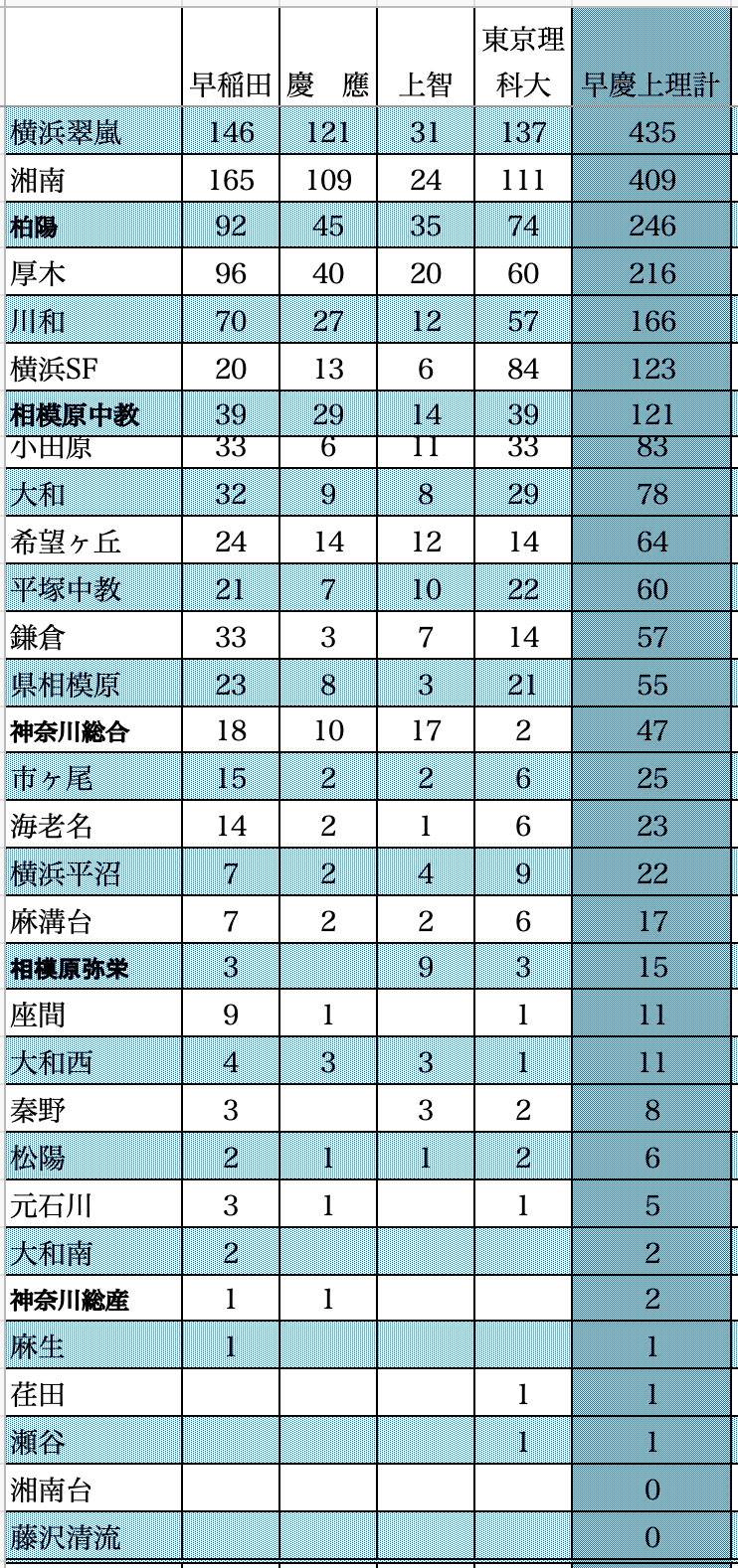 以下に続くのが進学重点エントリー校です。小田原、大和、希望ヶ丘、鎌倉、相模原などです。ただ、ここになるとガクンと合格者の数は減ってしまい、実数としては20名前後が早慶上理大レベルに合格できたというところではないでしょうか。全校生徒の1割ほどと考えて良いでしょう。