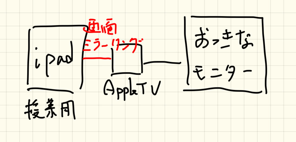 ふだんの授業は、iPadをAppleTVにミラーリングでつなぎ、そこからおっきなモニターに映し出したものを生徒たちはみながら授業を受けています。