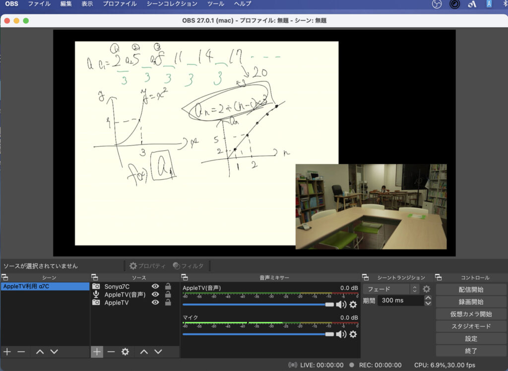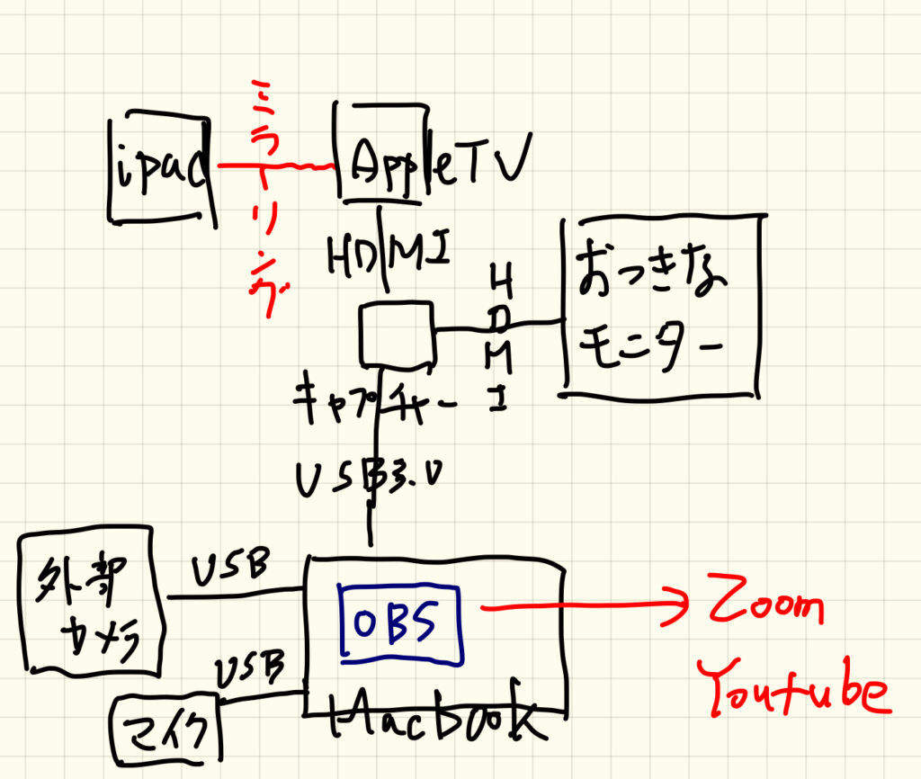 新たに購入したのは2千円ちょっとのキャプチャーボードだけです。AppleTVからの映像をキャプチャーで「おっきなモニター」と「Macbook」に分岐させます。Macbookではこの映像と、授業の様子全体をカメラで映した映像+音声を「OBS」というアプリで合成し、その合成画像をZOOMで生徒に送ります。